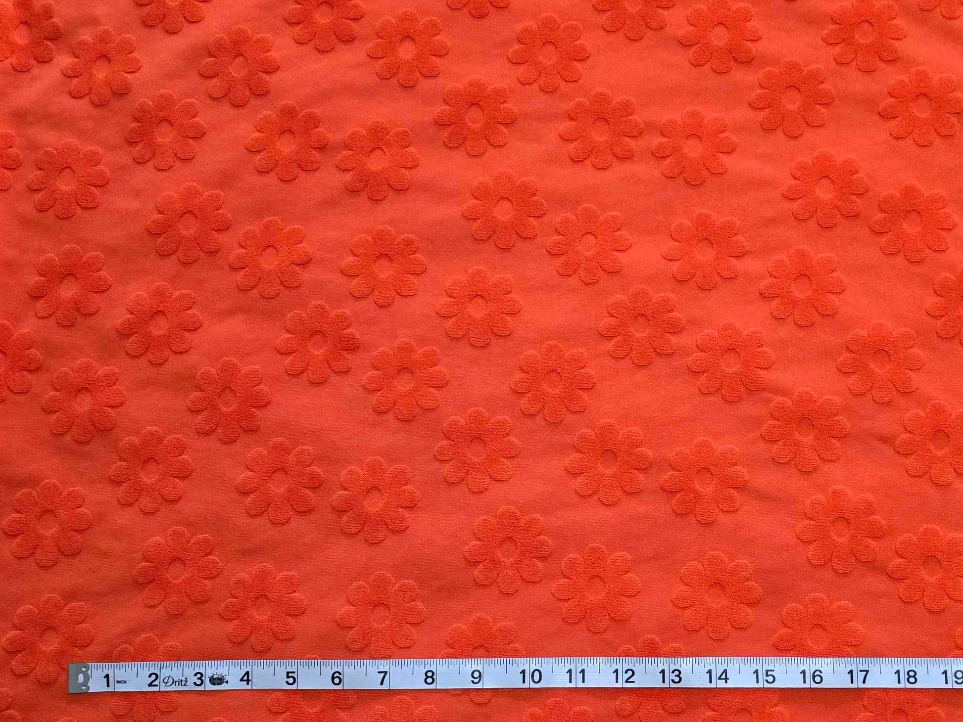 Who wouldn’t want to drape their bodies in this incredibly soft fabric? This is a 4-way stretch knit made of 95% polyester/5% spandex. The flowers are raised and have a soft feeling. Back is smooth.